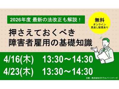 障害者の就労支援を中心にソーシャルビジネスを展開する株式会社ゼネラルパートナーズ(本社:東京都千代田区、代表取締役社長:進藤均)は、4月16日(木)・23日(木)に、障害者雇用の基礎知識に関する無料オンラインセミナーを開催します。