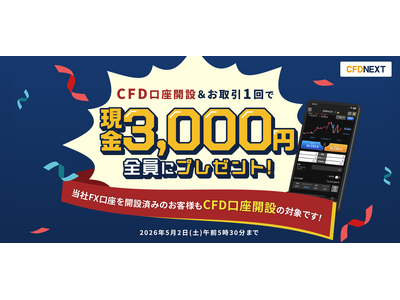 株式会社外為どっとコム(本社:東京都港区、代表取締役社長:竹内 淳)は、『CFDネクスト』におきまして、2026年3月30日(月)より「口座開設&お取引1回でもれなく現金3,000円をプレゼント!キャンペーン」を実施します。