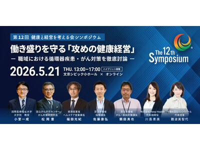 一般社団法人健康と経営を考える会(東京都文京区、代表理事:高谷典秀・山本雄士)は、2013年に健康経営推進を目的として設立し、この度、2026年5月21日(火)に第12回シンポジウム『働き盛りを守る「攻めの健康経営」』をハイブリッド開催(東京都文京区 文京シビック小ホール・Zoom Webinar)で開催いたします。第一部では、健康経営における循環器疾患対策をテーマに、国際医療福祉大学大学院・小室一成教授に基調講演いただきます。その後、小室教授、福田光紀・経済産業省ヘルスケア産業課長、佐藤康弘・厚生労働省保険課長、川島恵美・(株)Keep Health代表取締役をパネリスト、当会代表理事・医療法人社団同友会 高谷典秀理事長をモデレーターとしてディスカッションを行います。