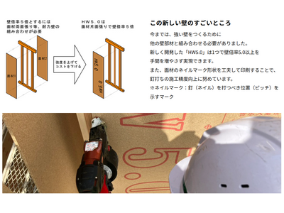 木製筋交いを用いた壁倍率5.0の大臣認定耐力壁としては第1号である「HW5.0Σ」や、施工効率と品質向上を両立する「HT Base基礎一体打ち工法」など、現場の課題から生まれた技術の開発背景や工夫についても分かりやすく紹介しています。
