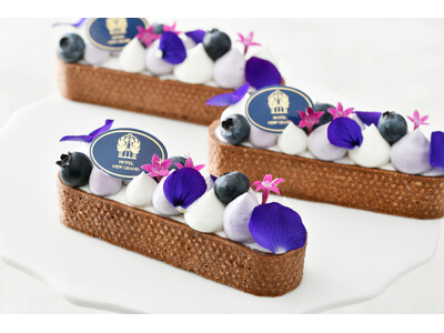 チョコレートのタルトをベースに、ブルーベリージャムとカスタードクリームを重ね、その上にはブルーベリーとフロマージュ2種のクリームを絞りました。甘さと爽やかな酸味の調和をお楽しみいただける一品です。トップに飾ったエディブルフラワーが目を引く、華やかでエレガントな期間限定のスイーツを、横浜中に花々が咲き誇るこの時期にぜひお召し上がりください。