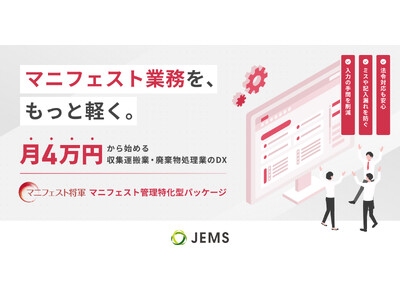 「静脈インフラをITで創造する」をパーパスに掲げる株式会社JEMS(本社:茨城県つくば市、代表取締役:須永裕毅、以下「JEMS」)は、収集運搬・廃棄物処理業者向けに、低コストですぐに利用できる『マニフェスト将軍』新パッケージプランの販売を開始いたします。
