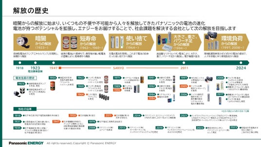 本ゲームは、暗闇の会場内で明かりを灯しながら、パナソニック エナジー事業に関する謎を解き進める体験型ゲームです。パナソニック エナジーは約100年間にわたり、電池関連の製品を通して人々をくらしの不便さや社会課題から解放することに貢献してきました。この「解放の歴史(