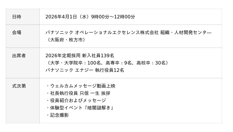 パナソニック エナジー株式会社(以下、パナソニック エナジー)は、本日、2026年4月1日、2026年度定期採用の新入社員139名を対象とした入社式(ウェルカムセレモニー)を実施しました。2026年度は、パナソニック エナジー初の試みとして、入社1~2年の若手社員の公募プロジェクトにより入社式を企画。森の中のキャンプ場に見立てて人工芝生やテントを張った会場に、アウトドアをイメージした服装で参加するなど、従来の入社式とは大きく異なる構成としました。