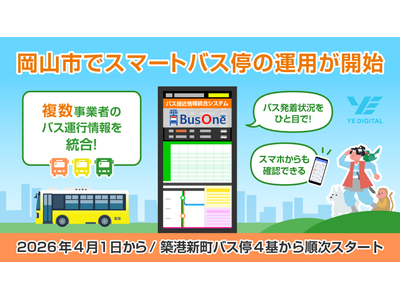 株式会社YE DIGITAL(本社:福岡県北九州市、代表取締役社長:玉井裕治、以下 YEデジタル)は、岡山市内の岡南方面の乗り継ぎ空間整備事業において、当社の「スマートバス停」が採用され、2026年4月1日より築港新町バス停に設置された4基から、順次運用が開始されることをお知らせいたします。