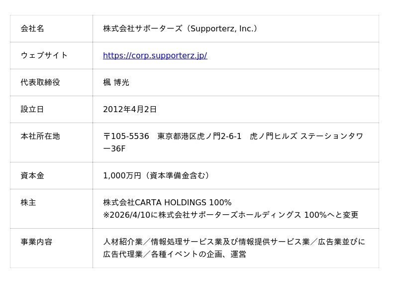 株式会社CARTA HOLDINGS(以下、「CARTA HD」)の前代表取締役社長執行役員兼CEOである宇佐美 進典は、新設した株式会社サポーターズホールディングス(本社:東京都渋谷区、代表取締役:宇佐美 進典、以下「サポーターズHD」)を通じて、CARTA HDが保有する株式会社サポーターズ(以下、「サポーターズ」)の全株式を譲り受けることについて合意いたしました。本件取引は、2026年4月10日に実行される予定です。