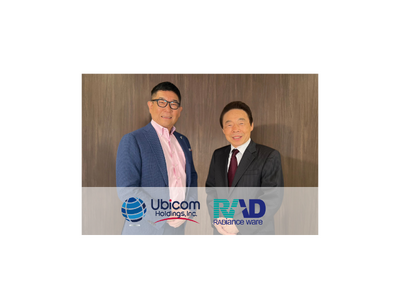 Ubicomホールディングス 代表取締役社長 青木 正之(左)とラジエンスウエア社 相談役 中嶋 吉男