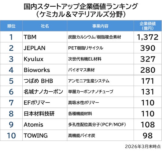 https://www.jmtc.co.jp/webinar/)を通じた情報発信も行っています。今回、「スピーダスタートアップ情報リサーチ」の情報をもとに、2026年3月末時点での、ケミカル&マテリアルズ分野における国内スタートアップについて企業価値ランキングを作成し、公表いたしました。