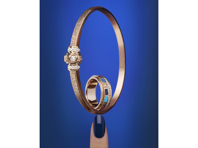 ポセション バイブラント パレスが新たな次元を呼び覚まします。詩的かつ雄弁な作品が豊富に揃ったこのコレクションは、パレス装飾のゴールドエングレービングの特徴と魅惑的なオーナメンタルストーンを組み合わせた、見事なハードストーン モザイクを導入しています。ピンクゴールドの輝き、磨き上げられたゴドロン、ハーフムーンセットのダイヤモンド、カラーストーンを組み合わせた貴重なディテールが際立ち、軽やかでありながらグラフィカルな形状を基調とした非対称性を表現しています。メゾンの長年にわたるサヴォアフェールに由来するそれぞれの石は唯一無二であり、それぞれのジュエリーを特別なものにしています。これらの生きた傑作では、石の質感、正方形や楕円形の多様なニュアンスの深さ、光の共鳴が絡み合い、絵画のように鮮やかで動きのあるコントラストを描きます。精巧にカットされた繊細なターコイズ、紺碧のソーダライト、そして魅力的なデュモルチェライトが、陶酔させるようなモザイクの中で調和して、作品を護符の地位に引き上げています。それぞれが、太古の昔から人々の想像力を魅了してきたお守りに呼応し、そのビジョンを蘇らせることで、ピアジェはジュエリーを守護石へと変貌させます。コレクションの美学は象徴性を親密に伝え、それぞれの輝くジュエリーに深い意味を込めています。多くの文化において繁栄と幸運の普遍的な象徴である環状のフォルムは、本質的に守護的な側面を持っています。