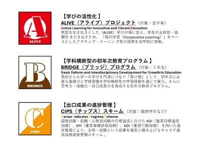 主体的・協働的な学びを促進する「ALIVE」「BRIDGE」「CIPS」の3本柱で、学生の成長と成果をさらに強化