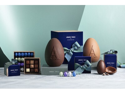 ミニエッグは、左から、ホワイトチョコレートベースのペア&シナモンとマンゴー&ジンジャー、ピーカンナッツとコーヒークランチ入りミルクチョコレート、バニラフィリング入りカカオ75%ダークチョコレートの4種。24個入りのボックスに加え、ティンボックス入りも展開します。さらに、アルマーニ / ドルチのシグネチャーである9個入りプラリネボックスも取り揃え、大切な方への贈り物としてはもちろん、ご自身へのご褒美にもふさわしい逸品です。