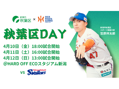 オイシックス新潟アルビレックス・ベースボール・クラブは4月10日(金)・11日(土)・12日(日)の東京ヤクルトスワローズとの3連戦を「秋葉区DAY」と題して、新潟市秋葉区の魅力を堪能できる3日間とすることをお知らせいたします。