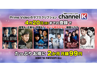 株式会社IMXC(IMXC、本社:東京都世田谷区、代表取締役社長:小宮之子)は、2026年4月1日(水)~2026年4月20日(月)までにご登録いただいた方を対象に、韓国ドラマをはじめとしたアジアのエンタメコンテンツ700作品以上を総合的に楽しめるPrime Videoのサブスクリプション「韓国ドラマ&エンタメChannel K」(以下「チャンネルK」)を最初の2か月間・月額99円(税込)でお楽しみいただける、この春きっと新たな物語と出会うお得なキャンペーンを実施いたします。