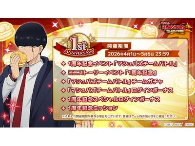 ポッピンゲームズジャパン株式会社(本社:東京都港区、代表取締役 CEO:谷口祐一郎)と合同会社MuscleMagic Gamesが開発・運営するアニメ『マッシュル-MASHLE-』初のスマートフォン向けゲームアプリ『マッシュル-MASHLE-マッスルパズル』(略称:マシュパズ)は2026年4月1日(水)より『1周年記念イベント』を開催いたしました。1周年を記念しての豪華な限定イベントやキャンペーンを実施しております。