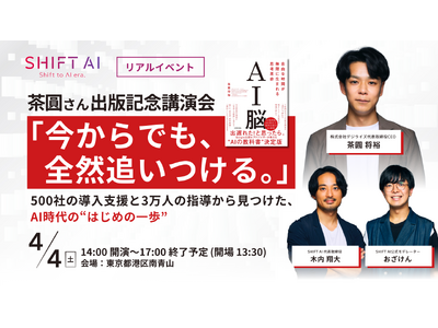 「日本をAI先進国に」をミッションに掲げ、利用者数No.1※の生成AI学習コミュニティ「SHIFT AI」を運営する株式会社SHIFT AI(本社:東京都渋谷区、代表取締役:木内翔大、以下:当社)は、2026年4月4日(土)に開催される株式会社デジライズ代表取締役・茶圓 将裕氏の新著『AI脳 自由な時間が無限に生まれる思考革命』(KADOKAWA刊)の出版記念講演会に、弊社代表の木内がゲスト登壇することをお知らせいたします。