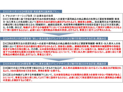 - また、DBについては、将来の給付水準が相対的に低下しないよう、加入者の退職後の生活におけるインフレ抵抗力が確保されるような給付改善等の検討が求められます