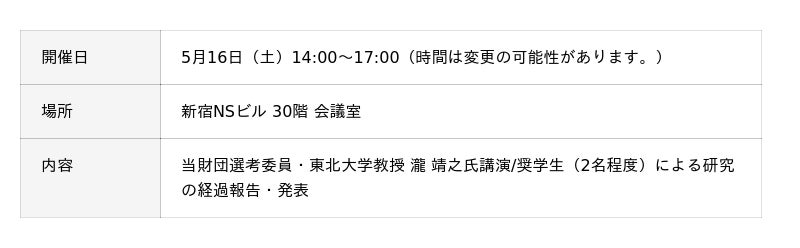 ※報告会は一般の方も参加可能です。詳しくは後日財団のホームページにてお知らせ致します。