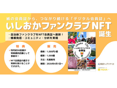 日本最大級のNFTマーケットプレイス「HEXA(ヘキサ)」を運営するメディアエクイティ株式会社は、茨城県石岡市観光協会および東武トップツアーズ株式会社と連携し、これまで紙カードで発行されていた「いしおかファンクラブ会員証」をNFT化したデジタル会員証「いしおかファンクラブNFT」を、2026年4月1日よりHEXAにて販売開始いたします。