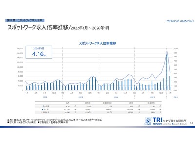 2026年1月度のスポットワーク求人倍率は4.16倍となりました。年末イベントなどがあった12月の繁忙期を終え、落ち着いた結果、求人数は前月比60.6%減少となり、求人倍率は前月から5.09ポイント減少しました。一方、前年同月からは1.76ポイント増加しています。