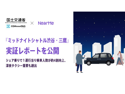 移動に関する社会課題の解決に取り組むソーシャルデザインカンパニー、株式会社NearMe(本社:東京都中央区、代表取締役社長:高原幸一郎、以下「ニアミー」)は、国土交通省が事業実施主体である地域交通DX推進プロジェクト「COMmmmONS」(コモンズ)において受託開発を行った“リアルタイム相乗りマッチングシステム”を活用した『ミッドナイトシャトル渋谷』『ミッドナイトシャトル三鷹』の運行を実施いたしました。本運行では、深夜帯におけるタクシー需給ミスマッチの解消や移動利便性の向上に向け、リアルタイム相乗りマッチングの有効性について検証を行いました。その実証結果を取りまとめたレポートを公開しましたのでお知らせいたします。なお、レポートの詳細は「COMmmmONS」のウェブサイト上(https://www.mlit.go.jp/commmmons/tech_report/?page=2)でご覧いただくことができます。
