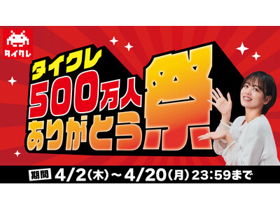 株式会社タイトー(本社:東京都新宿区、以下タイトー)が運営する、おうちでクレーンゲームが楽しめる「タイトーオンラインクレーン(以下タイクレ)」の登録者数が500万人を突破したことをお知らせいたします。また、500万人突破を記念し「タイクレ500万人ありがとう祭」(以下ありがとう祭)を4月2日(木)より開始します。「ありがとう祭」では、これまで支えてくださったお客様への感謝の気持ちを込めて、総額500万円相当のTC(タイトーコイン)※プレゼントキャンペーンや景品獲得の大チャンスとなる期間限定台の展開など、タイクレをお楽しみいただいているお客様は見逃せない特別イベントを開催いたします。ぜひこのお得な機会をお見逃しなく!