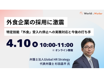 クックビズ株式会社のグループ会社で、国内特定技能外国人の紹介・登録支援に強みを持つワールドインワーカー株式会社(本社:東京都中央区、代表取締役社長:藪ノ 賢次、以下ワールドインワーカー)は、2026年4月10日(金)10:00より、特定技能「外食」分野の受入れ停止措置に伴う緊急ウェビナーをオンラインにて開催いたします。(参加費無料・事前登録制)
