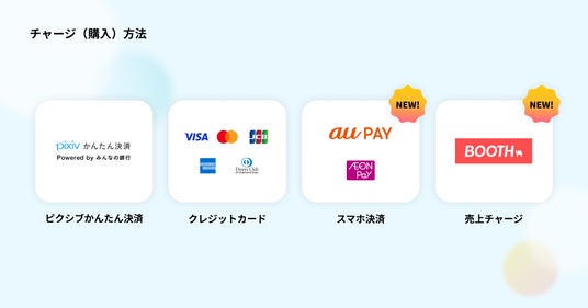 従来のチャージ方法に加え、新たにau PAYやAEON Payといった「スマホ決済」によるチャージが可能になりました。さらに、クリエイターの皆さまの創作活動をサポートする新機能として、BOOTHの売上からpixivcobanにかんたんにチャージできる機能をリリースしました。