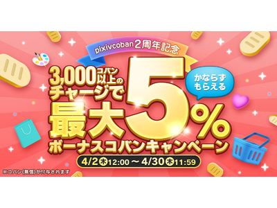 ピクシブ株式会社(本社:東京都渋谷区、代表取締役CEO:丹羽 康弘、以下ピクシブ)が運営する、「BOOTH」「pixivFANBOX」「pixivFACTORY」でのお支払いに利用できるプリペイド式電子マネー「pixivcoban」は、2026年4月2日(木)にサービスリリースから2周年を迎えます。これを記念して、同日より「pixivcoban2周年記念!最大5%必ずもらえる!ボーナスコバンキャンペーン」を実施します。
