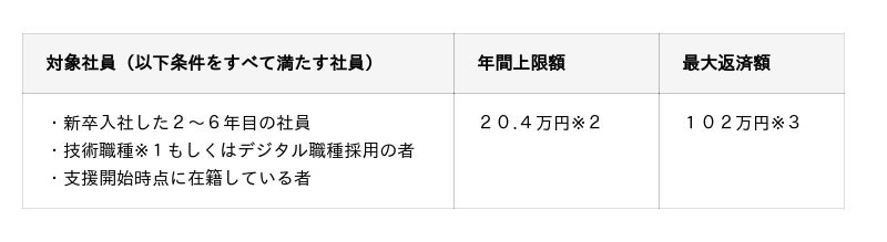 人財獲得や若手社員の処遇改善を目的として、奨学金を受給していた一部の社員を対象に独立行政法人日本学生支援機構(JASSO)の代理返還制度を活用し、奨学金の一部もしくは全額の返済を支援します。