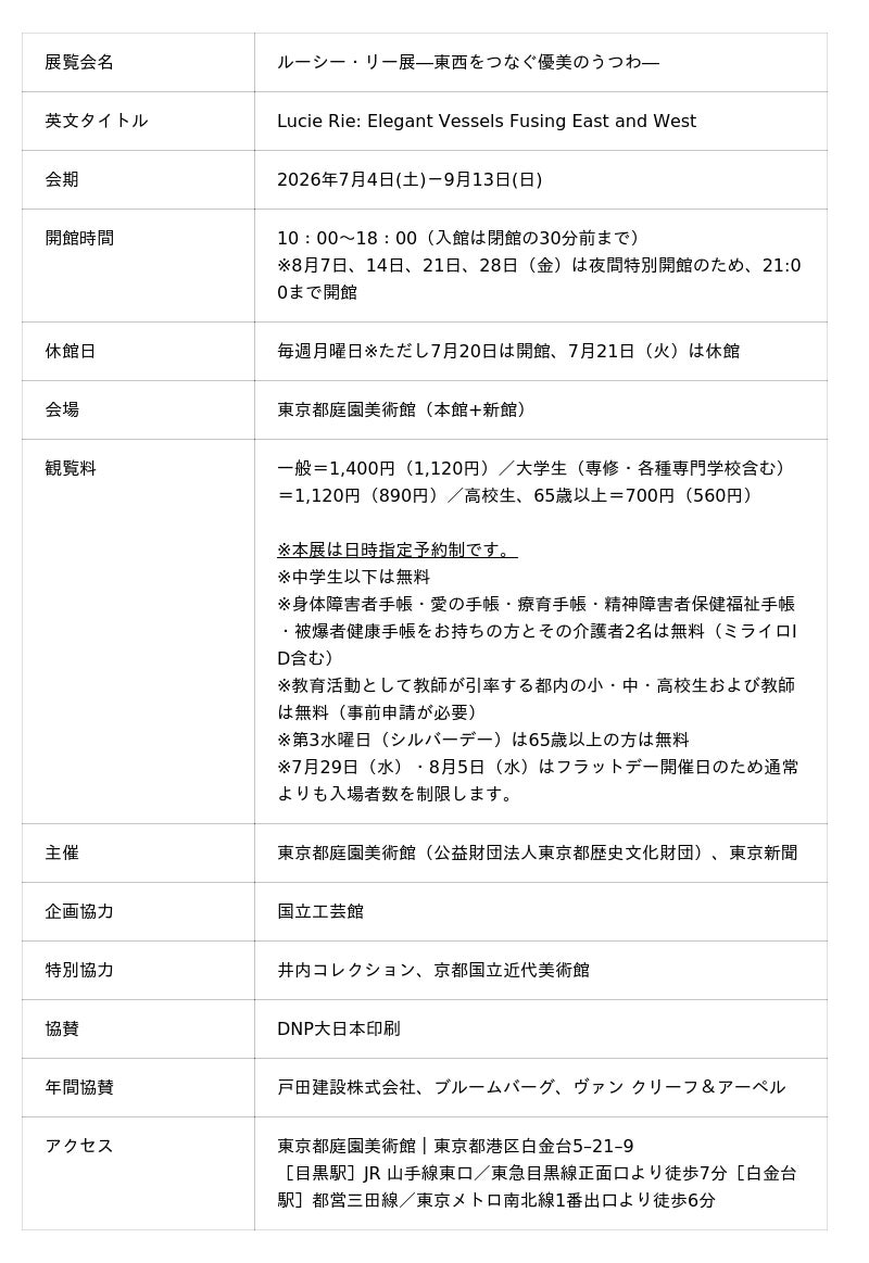 東京都庭園美術館では、2026年7月4日(土)- 9月13日(日)の会期で「ルーシー・リー展 ―東西をつなぐ優美のうつわ―」展を開催いたします。