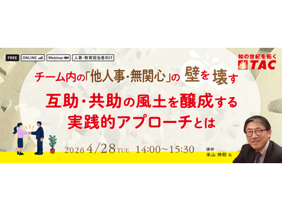 公認会計士や税理士など、多くの国家資格や検定試験の受験指導などの教育事業を展開しているTAC株式会社(東京都千代田区、代表取締役:多田敏男)は、法人向け人材教育部門から、「チーム内の「他人事・無関心」の壁を壊す 互助・共助の風土を醸成する実践的アプローチとは」セミナーを2026年4月28日(火)に開催します。