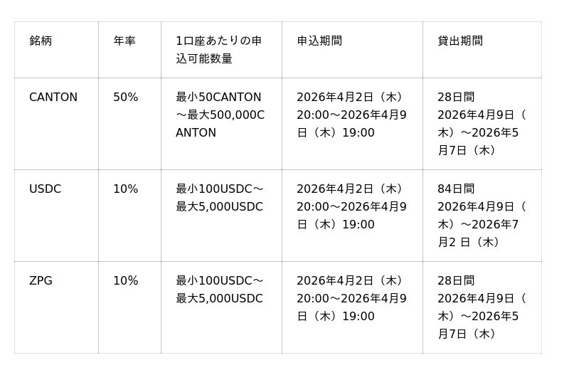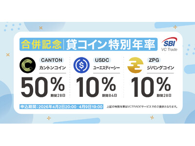 SBIホールディングス株式会社(本社:東京都港区、代表取締役会長兼社長:北尾 吉孝)の連結子会社で暗号資産交換業を営むSBI VCトレード株式会社(本社:東京都港区、代表取締役社長:近藤 智彦、以下「当社」)は、2026年4月2日(木)より、「【SBI VCトレード・ビットポイント合併記念】特別年率での貸コイン募集~一挙3銘柄!CANTON年率50%、USDC年率10%、ZPG年率10%~」の募集を開始します。
