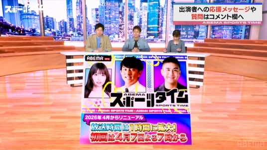 また番組の最後には、『ABEMAスポーツタイム』が4月よりリニューアルすることも発表。今後は月1回、放送時間は30分拡大の1時間となり、より濃密な内容で選手の声や独自取材映像を届けていくことが明かされました。4月は7日(火)夜7時より放送。今後もより深く、より熱くスポーツの魅力をお伝えする本番組にご期待ください。