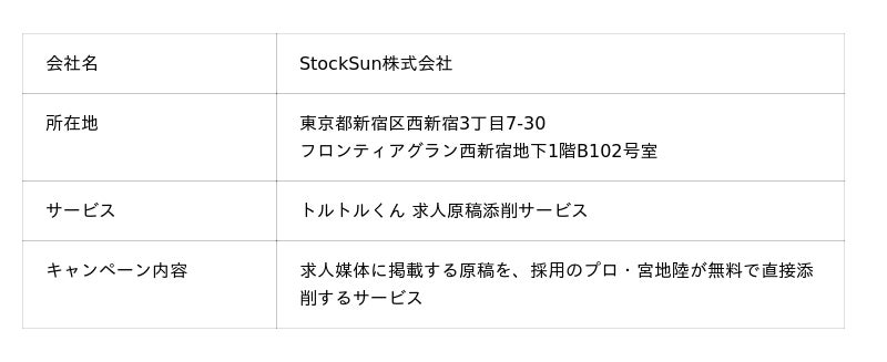 StockSun株式会社は、採用代行サービス『トルトルくん』の契約者向けキャンペーンとして、採用のプロ・宮地陸による求人原稿の無料添削サービスを開始しました。求人媒体に掲載する原稿の質を高め、応募獲得につなげたい企業を支援します。