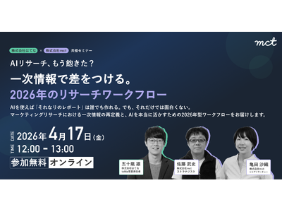 人間中心デザインとCX経営を支援する株式会社mct(本社:東京都渋谷区、代表取締役:白根英昭、以下mct)と、コンテンツプラットフォームおよびB2Bマーケティング支援を展開する株式会社はてな(本社:京都市中京区、代表取締役社長:栗栖義明、以下はてな)は、2026年4月17日(金)に共催ウェビナー『AIリサーチ、もう飽きた?|一次情報で差をつける、2026年のマーケティングリサーチワークフロー』を開催することをお知らせいたします。