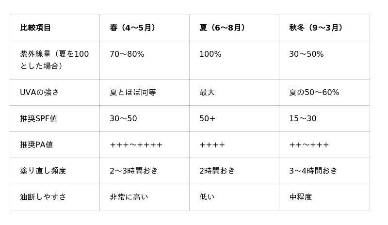 季節別の紫外線量と推奨される対策の比較