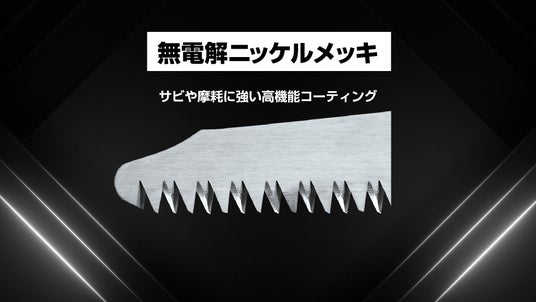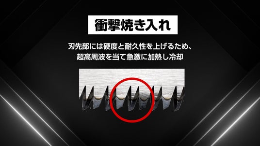 全モデル共通の特長として、刃先の表面硬度を高め、耐久性と切削スピード向上に寄与する「衝撃焼き入れ」と、生木や竹など水分を含んだ鋸屑の付着による錆を抑え、保管時も扱いやすい「無電解ニッケルメッキ」を採用しています。