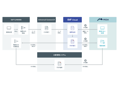 新たな基幹システムは2023年5月から運用を開始しました。現在では、会計コアであるSAP S/4HANAから出力される会計関連の帳票に加え、フロントエンドを担う Pega Platformから発行される請求書、見積書、発注書など各種報告書がすべてSVF Cloudを経由して出力されています。