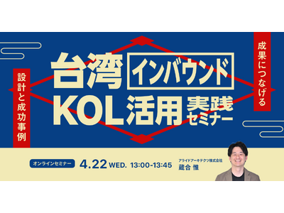 データとクリエイティブの力でマーケティングコミュニケーションを設計し、企業のマーケティングAXを支援するアライドアーキテクツ株式会社(本社:東京都渋谷区、取締役社長:村岡弥真人、証券コード:6081、以下「当社」)は、4月22日(水)に無料オンラインセミナー「台湾インバウンドKOL活用 実践セミナー~成果につなげる設計と成功事例~」を開催いたします。