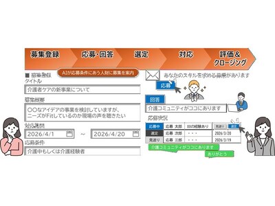 本サービスは、社員が登録した業務経験やスキル、資格を元に、副業を依頼したい部署が検索することで適切な社員を見つけられるものです。新機能では、部門が募集内容を登録すると、AIがマッチングを行い、関心や適性が高い社員に推薦します。また、募集内容は公開され、社員が自ら応募でき、部門は複数人からアイデアや意見を募集することもできます。これにより、AIが社員個人の得意分野や経験をもとに最適な案件とマッチングし、社員の活躍機会の拡大と自律的なキャリア形成を加速させます。さらに、企業は多様な視点やアイデアを得ることで価値創出につなげられます。