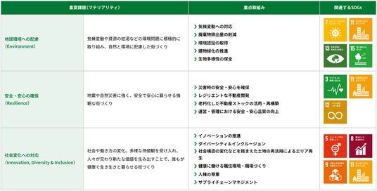 日鉄興和不動産は、総合デベロッパーとして、持続可能な社会・都市を実現していくことが使命であると考え、「地球環境への配慮」「安全・安心の確保」「社会変化への対応」を、全社横断的に取り組む重要課題(マテリアリティ)として定めています。