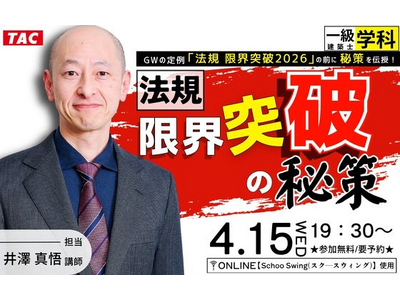 とっておきの「秘策」=得点アップのための一歩踏み込んだ内容を伝授します!GWには、TAC「法規限界突破」シリーズ「1.法規特訓テスト、2.法改正出題予想講座、3.告示出題予想講座」もご用意していますので、そちらもご検討ください。