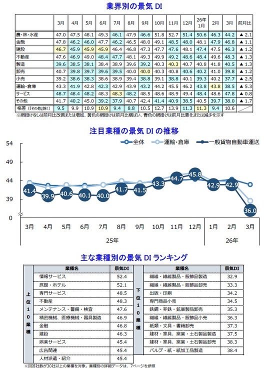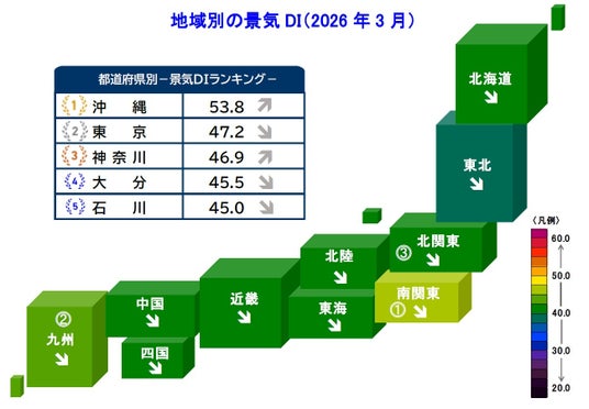 株式会社帝国データバンクは、調査対象(2万3,349社、有効回答企業1万312社、回答率44.2%)を対象とした2026年3月の国内景気動向を調査・集計し、景気DIとして発表いたしました。
