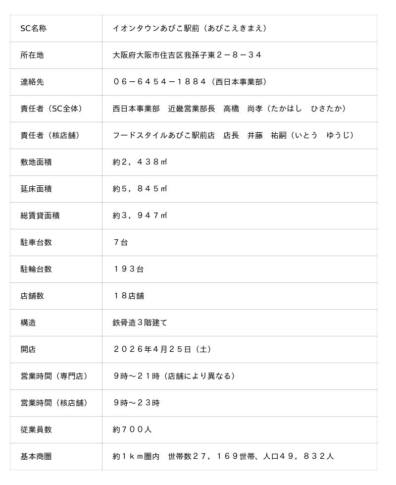 イオンタウン株式会社(本社:千葉県千葉市美浜区、代表取締役社長:加藤久誠)は、4月25日(土)大阪府大阪市住吉区にショッピングセンター「イオンタウンあびこ駅前」(以下:当SC)をグランドオープンいたします。