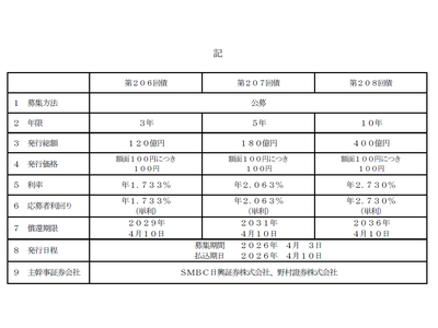 ・発行総額は3年債が120億円、5年債が180億円、10年債が400億円、合計700億円です。