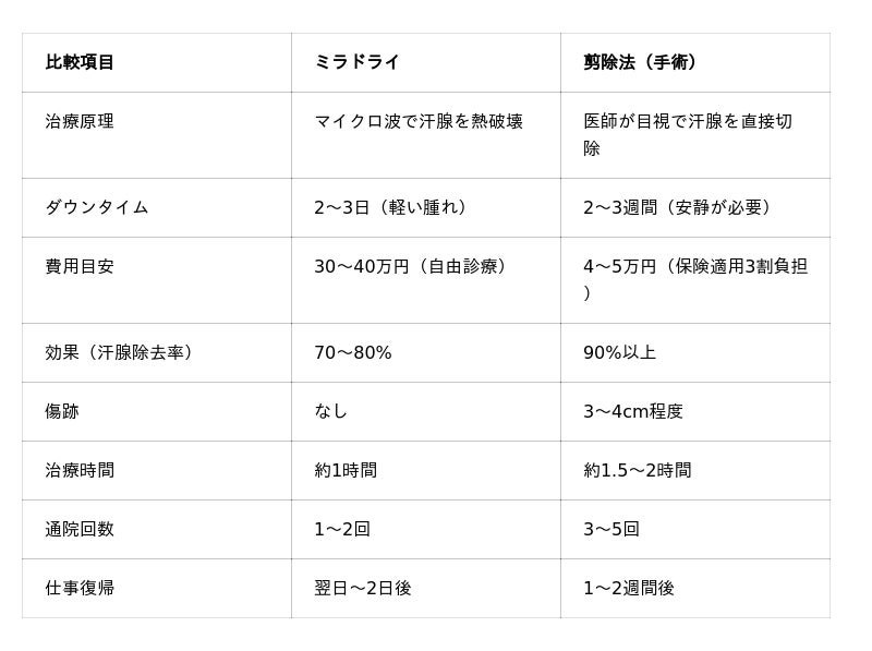 ミラドライは皮膚を切らずにマイクロ波で汗腺を破壊する治療で、ダウンタイム2~3日、費用30~40万円、汗腺除去率70~80%が目安です。剪除法は保険適用で費用4~5万円(3割負担)、汗腺除去率90%以上と高い根治性がありますが、ダウンタイムは2~3週間必要です。当院監修医師の2,000件以上の治療実績から、症状の重症度とライフスタイルに応じて最適な治療法をご提案しています。