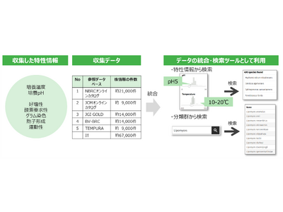 本データベースは、一般公開されている五つの国際的に主要なデータベースに収載されている微生物株情報約67000件から、培養温度、培養pH、酸素要求性などの微生物に関する重要な7種類の特性情報を収集し、微生物種ごとに整理・統合したデータベースで、特性情報から微生物種を日本語で横断的に検索することが可能です。特性情報から微生物種を検索できる統合データベースは、国内初となります。