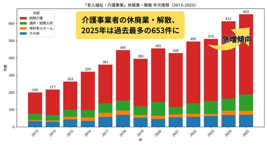2025年の介護事業者の休廃業・解散は653件と過去最多を更新。倒産件数176件の約3.7倍にあたる事業者が、事業継続を断念しています。