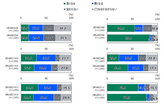 「自国の将来」に関しては「良くなる」がインド、中国で過半数を超えてはいるものの、残る4カ国は「悪くなる」が上回っています。とはいえ、そのインド、中国に加え韓国でも「良くなる」の割合は減っており、特に中国は約30ポイント減少しています。日本は16%と前回から微増したものの今回も最下位。ちなみに19年に行った第20回9カ国調査で「良くなる」と答えた日本の若者は9.6%、「悪くなる」の約4分の1でした。