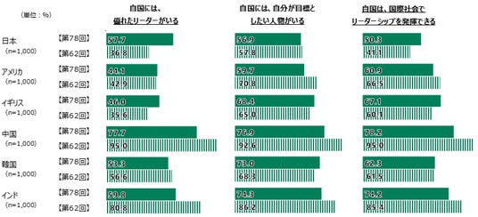「自国の現状」では「優れたリーダーがいる」に同意する回答が日本は60%弱とアメリカ、イギリス、韓国より高く、前回調査結果を約20ポイント上回っています。「自国は、国際社会でリーダーシップを発揮できる」も上昇していますが、他の5カ国に比べると10~20ポイント低い数字に留まっています。